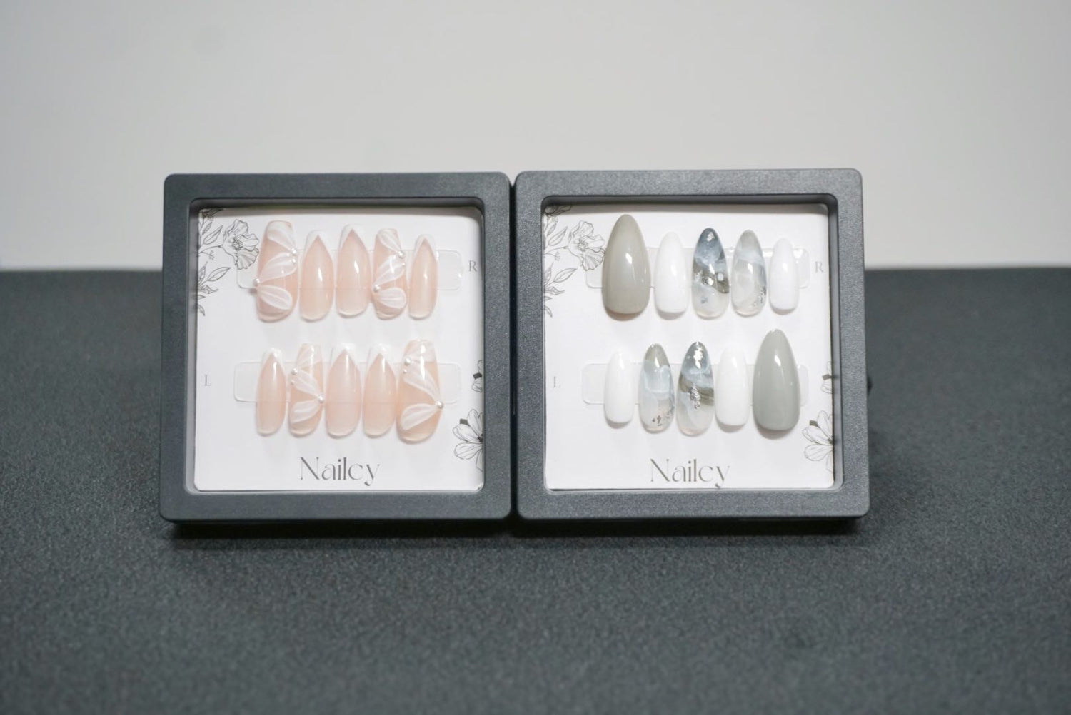Son creaciones hechas a mano, no son de plástico, son tips de softgel. Se pintan exactamente igual que las uñas hechas en los salón de belleza y están hechas con los mismos materiales: gel, acrílico, esmaltes semipermanentes, etc. En cada diseño aplicamos varias capas de productos entre la capa base, la capa de color y el acabado.